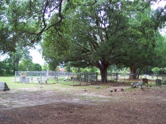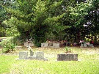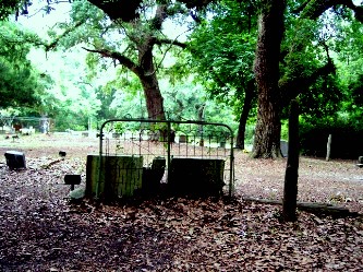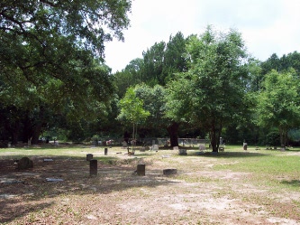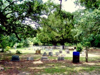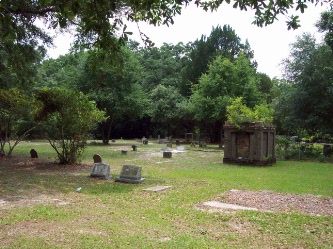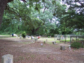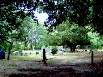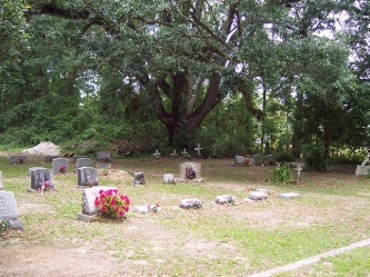 Sparse of burial plots, the grounds remain in solitude, sheltered by several large Live Oaks and two large Camphor trees at center.